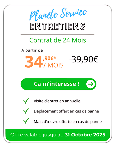 * Prix plancher variable selon la région et les caractéristiques de l’installation. Lors de la visite d’entretien, le technicien vérifie la conformité et l’état de l’installation, et peut vous demander de procéder à la réalisation de travaux à vos frais. En cas de refus, le contrat sera résilié de plein droit et Planète Service Groupe vous remboursera les sommes perçues au titre du contrat. **Conditions de l’offre : Offre non cumulable réservée aux nouveaux clients particuliers n’ayant pas été sous contrat dans les 12 derniers mois de l’année qui précèdent cette souscription et résidant dans une zone éligible à nos services.