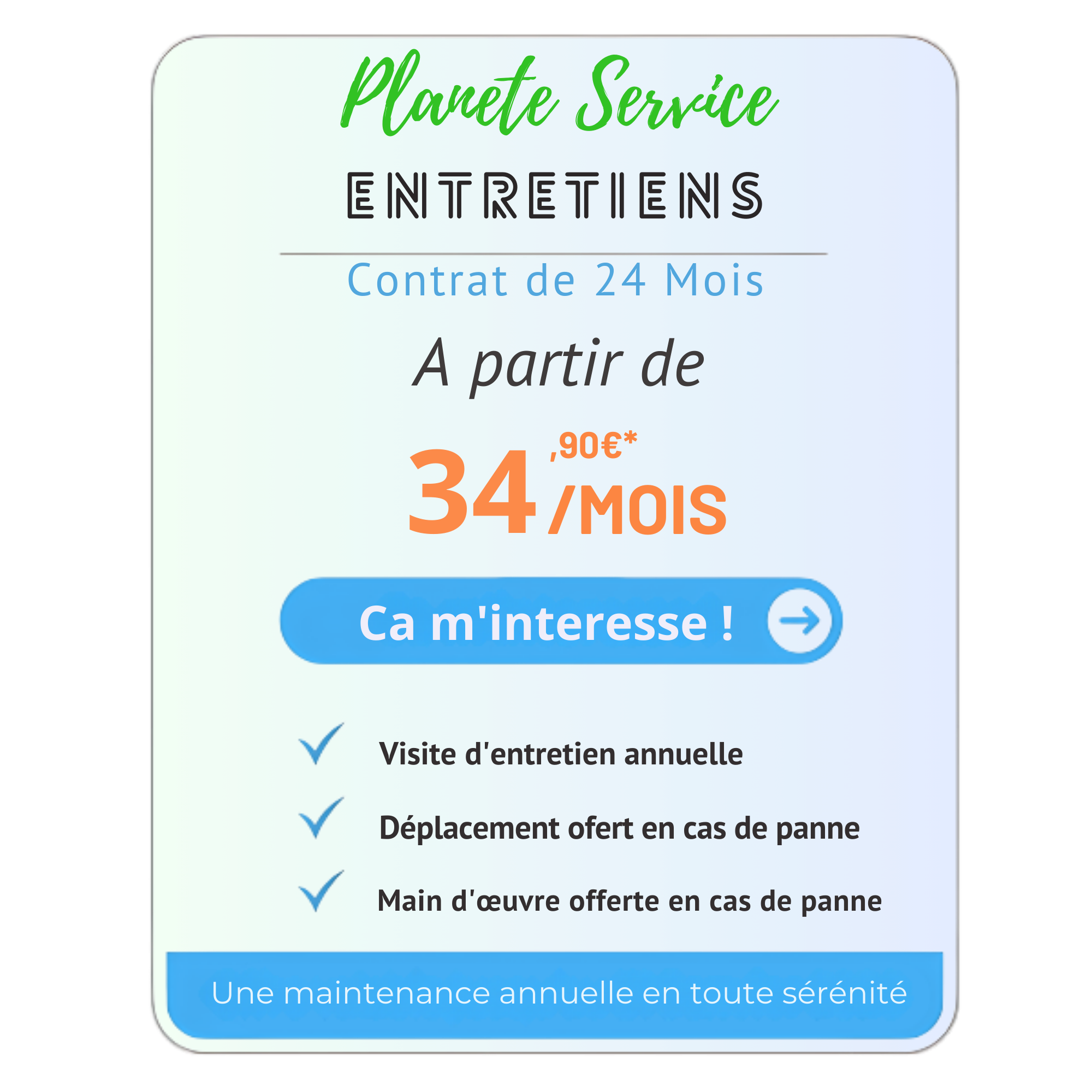 * Prix plancher variable selon la région et les caractéristiques de l’installation. Lors de la visite d’entretien, le technicien vérifie la conformité et l’état de l’installation, et peut vous demander de procéder à la réalisation de travaux à vos frais. En cas de refus, le contrat sera résilié de plein droit et Groupe Planète Service vous remboursera les sommes perçues au titre du contrat. **Conditions de l’offre : Offre non cumulable réservée aux nouveaux clients particuliers n’ayant pas été sous contrat dans les 12 derniers mois de l’année qui précèdent cette souscription et résidant dans une zone éligible à nos services.
